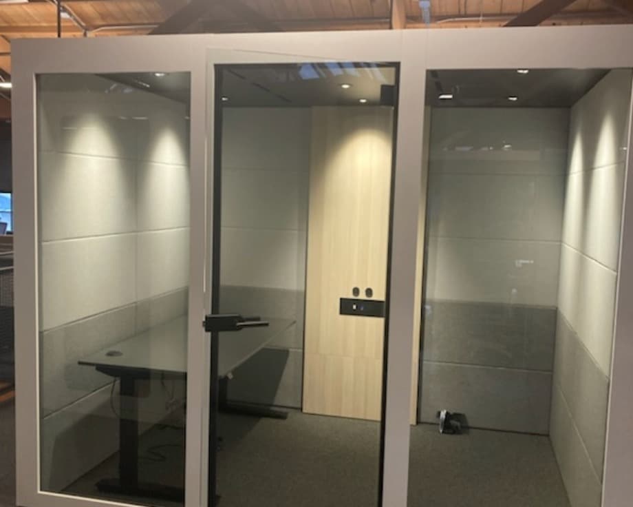 The objective was to create a professional, sound-insulated environment that could be used for team meetings, private conversations, and focused discussions without interrupting the surrounding workplace.