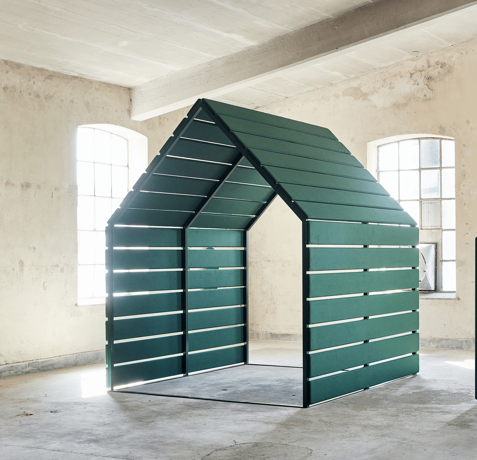 The exterior of the Barn Meeting Booth has a white metal frame in 40 mm square tubes which stands on a frame in flat iron with all parts coupled with hidden connection angles. The acoustic fabric panels that form walls and roof are hooked onto the frame. The panels are made from 19 mm lightweight MDF with 6 mm polyether and fabric.