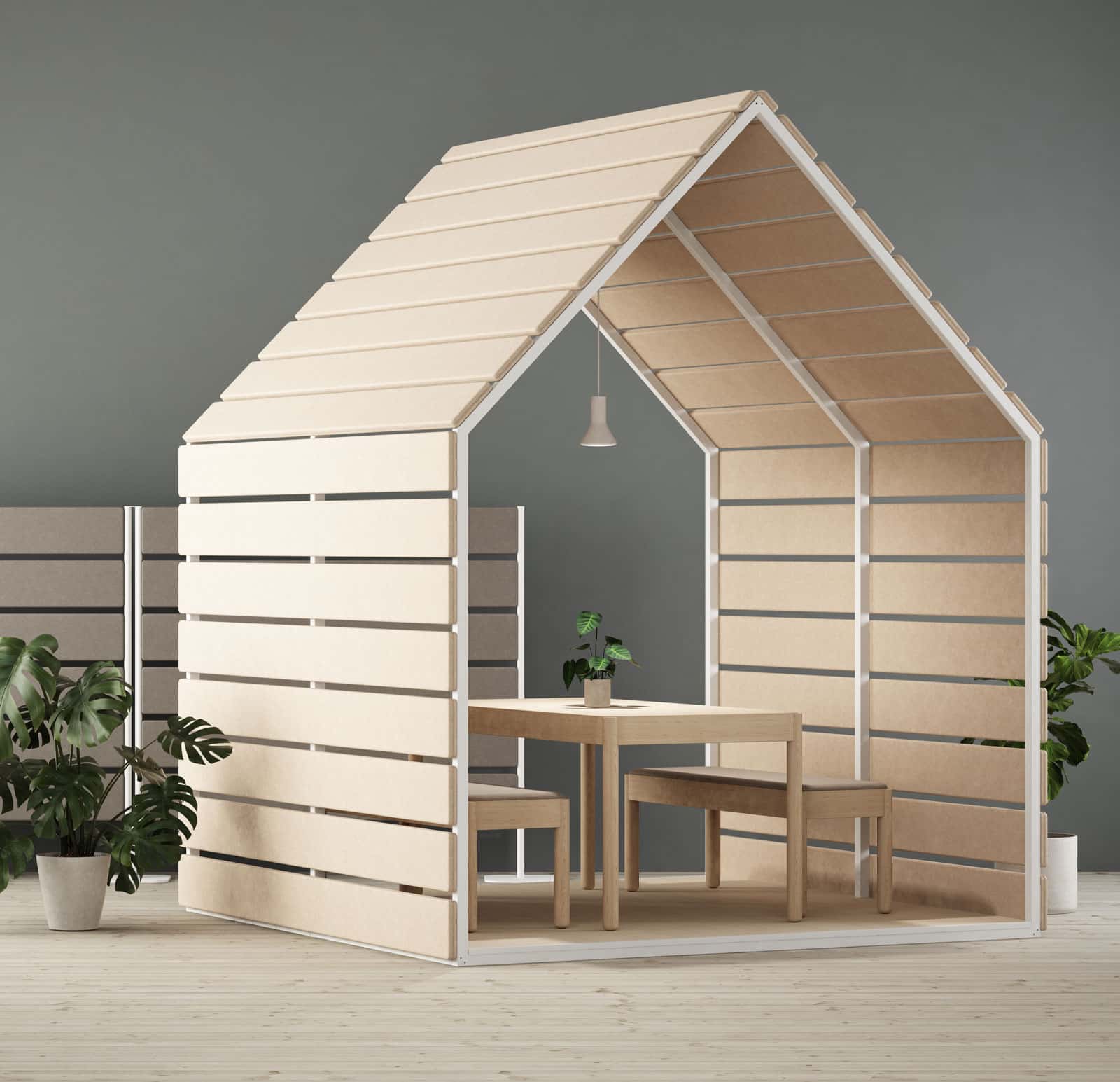 This Meeting Booth is made up of acoustic panels of fabric, mounted at distances, giving the furniture a balanced combination of sound absorption and transparency. High-quality materials make the Barn Meeting Booth, durable and long-lasting.