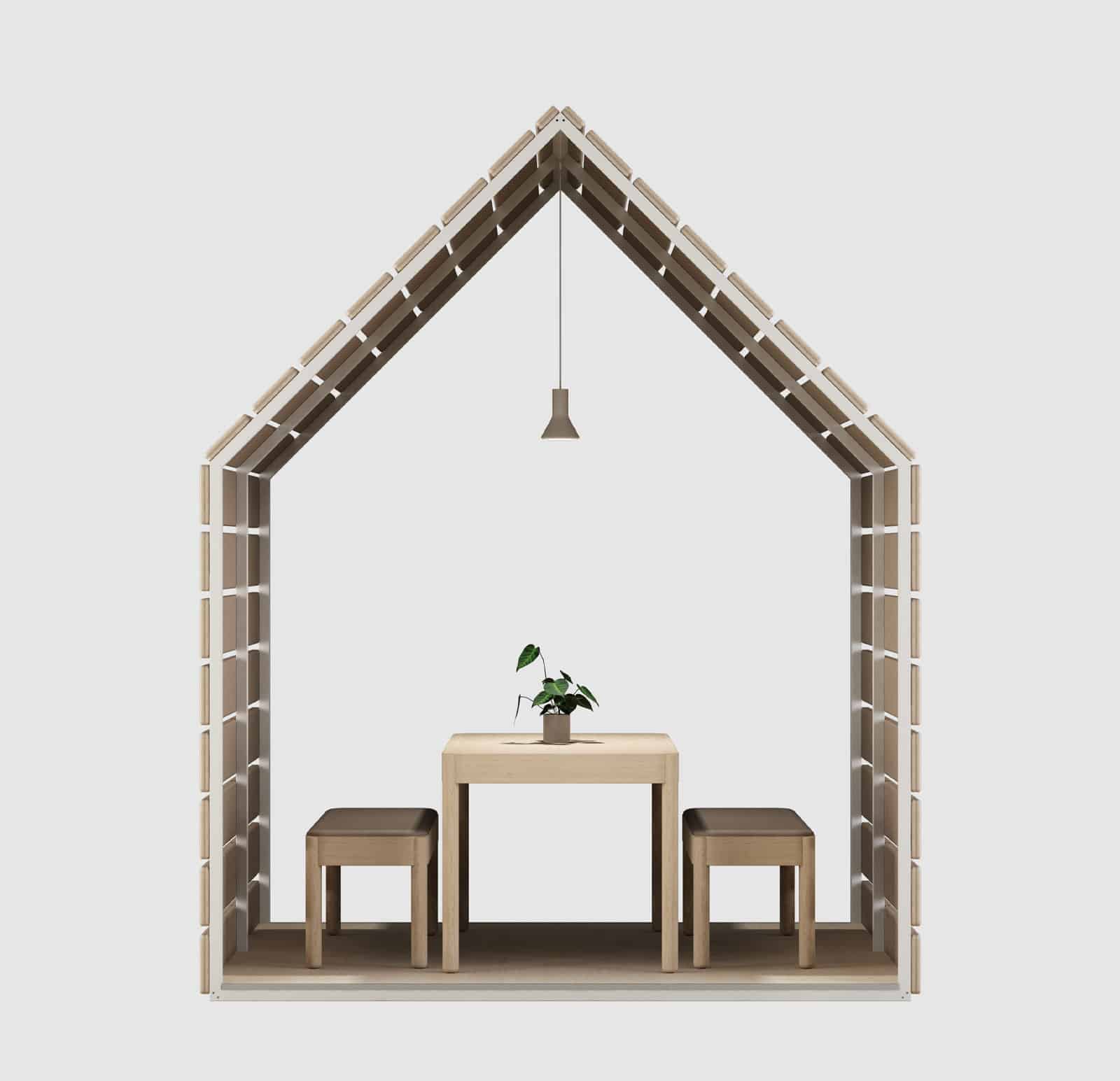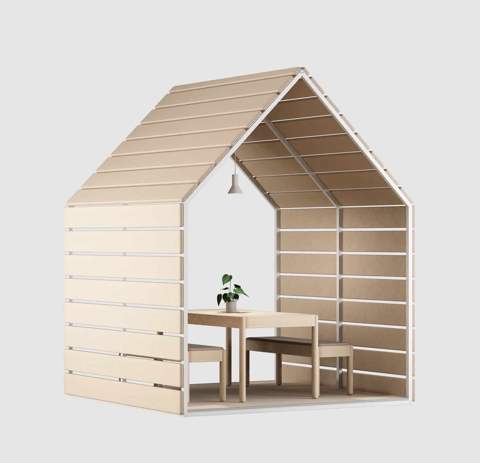 Meeting Booths and pavilions have become a popular feature in public interiors, particularly in office buildings, airports, and libraries. These enclosed spaces offer a private and comfortable place for individuals or small groups to hold meetings, make phone calls or work on projects without any distractions. This Meeting Booth is made up of acoustic panels of fabric, mounted at distances, giving the furniture a balanced combination of sound absorption and transparency. High-quality materials make theย Barn Meeting Booth, durable and long-lasting.