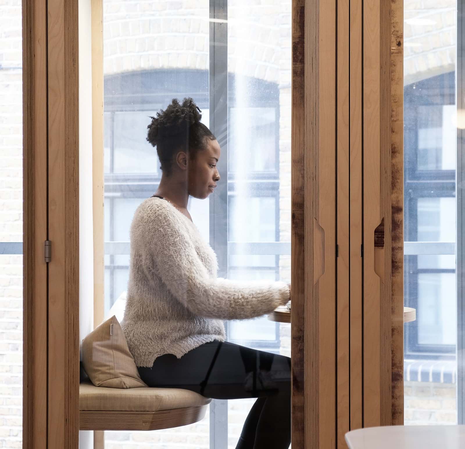 On the inside the Residence Duo Pod has laminated walls available in a variety of colours to match or contrast with the external panels. The rear panel can also be acoustic laminated clear glass to match the doors, which provide a view to the office, keeping workers connected with the exterior while in complete solitude.