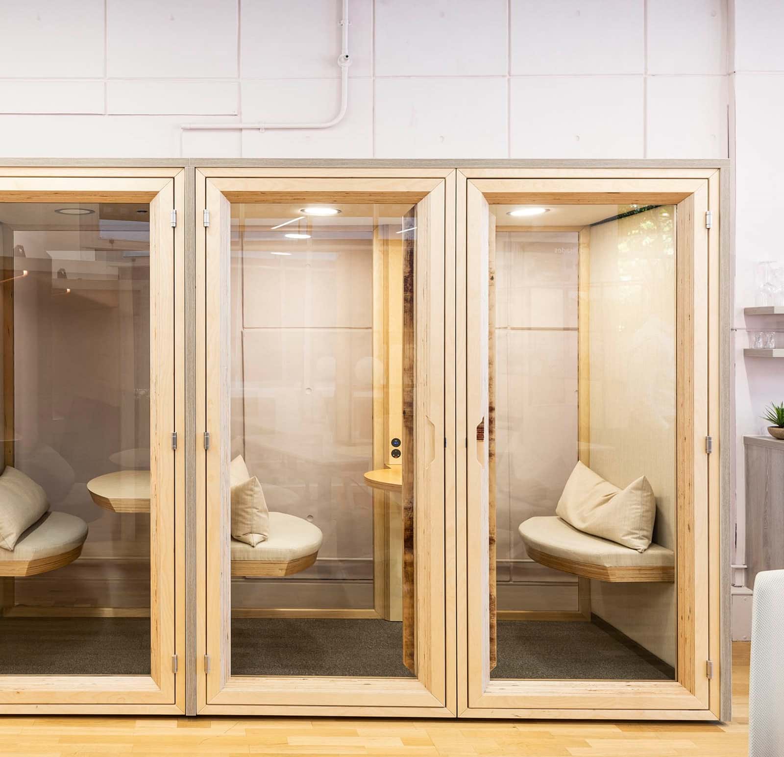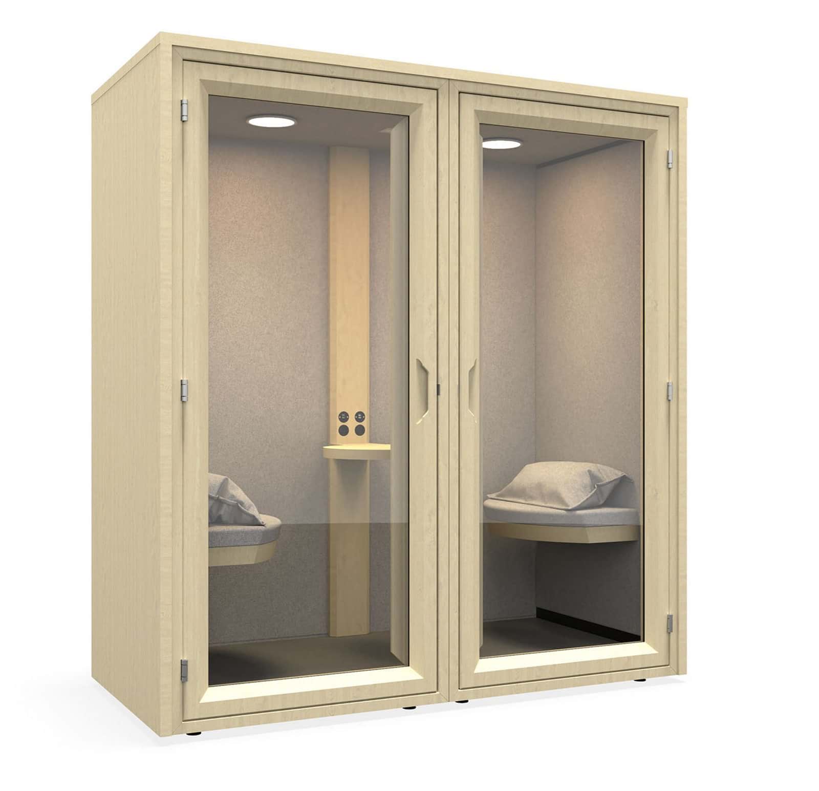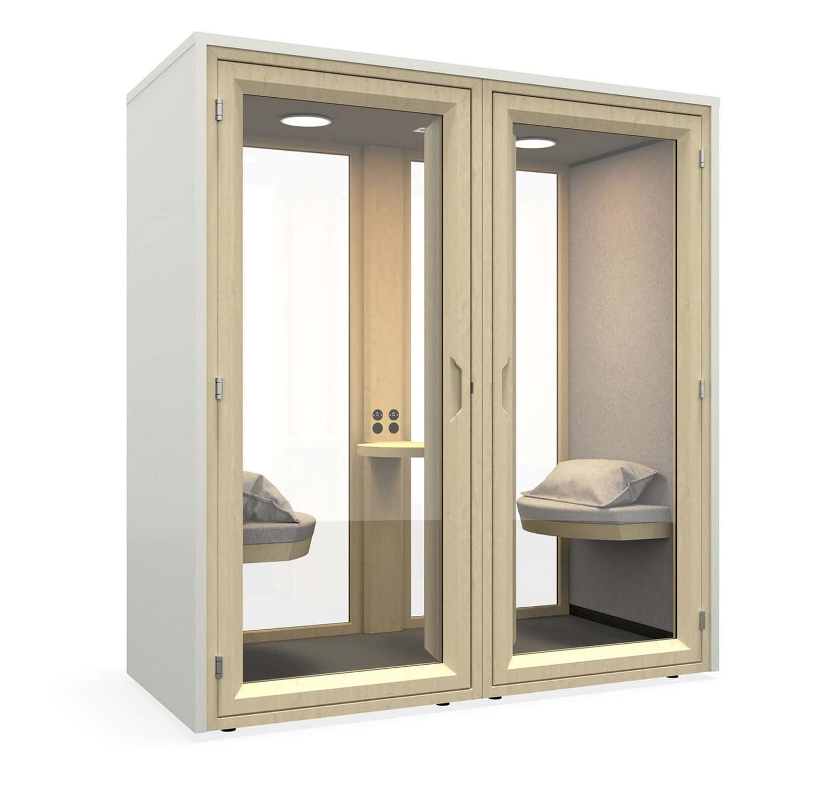 The Residence Duo Pod is the ideal solution for office spaces in desperate need of private rooms to hold small meetings of up to two people without having to embark on costly and lengthy building works. This meeting pod is an enclosed, self-contained, fully functional structure with advanced acoustic properties, it has been laboratory tested to 29db. The structure in itself has a simple, yet elegant design with premium furniture-grade wood wall panels on the exterior that are available in a variety of finishes to match even the most demanding office interior concept.